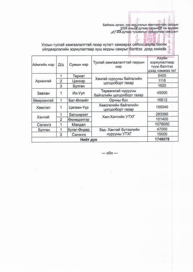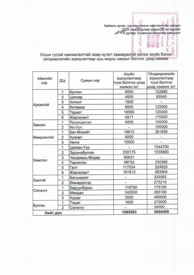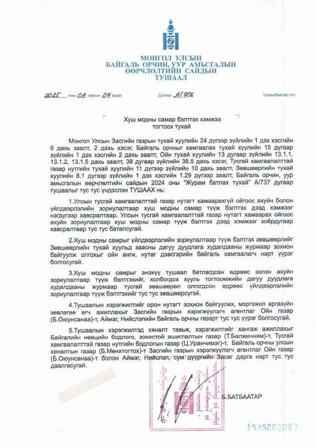 Хуш модны самар бэлтгэх хэмжээг тогтоолоо хуваалцах FacebookTwitterPinterestWhatsApp 2025 оны 09 сарын 05 11:55 Байгаль орчин, уур амьсгалын өөрчлөлтийн сайдын 2025 оны 09 дүгээр сарын 04-ний өдрийн А/706 тоот тушаалаар Хуш модны самар бэлтгэх хэмжээг тогтоолоо. өмнөх нийтлэлМонгол Улсын Ерөнхий сайд Г.Занданшатар ОХУ-ын Ерөнхийлөгч В.В.Путинд бараалхлааДараагийн нийтлэлМосква жолоочгүй автобус үйлчилгээнд явуулж эхэллээ Сэтгэгдэл бичих Хариу цуцлахЁс бус үг хэллэг ашиглахыг хориглоно санал: Сэтгэгдэл оруулна уу! нэр: энд нэрээ оруулна уу Намайг дараагийн удаа сэтгэгдэл бичихдээ энэ хөтөч дээр миний нэр, имэйл, вэбсайтаас аваарай. Δ Их уншсан Алтай хотхоны уулзвараас Нарны хороолол хүртэлх 680 метр авто замын ажлын явц 67 хувьтай байна Нийтийн тээвэр карт уншигч нэг төхөөрөмжөөр үйлчилнэ 2026 оны I ээлжийн цэрэг татлага нийслэлд тавдугаар сарын 1-нд эхэлнэ Нисэхээс Нүхт хүртэлх 2 км авто замын ажлыг эхлүүллээ “Улаанбаатар марафон-2026”-д 23 мянга гаруй хүн бүртгүүлжээ Холбоотой мэдээбусад мэдээ Алтай хотхоны уулзвараас Нарны хороолол хүртэлх 680 метр авто замын ажлын явц 67 хувьтай байна 2026 оны 04 сарын 30 14:44 Нийслэлийн Баянгол дүүргийн 24, 26 дугаар хороо, Алтай хотхоны... Нийтийн тээвэр карт уншигч нэг төхөөрөмжөөр үйлчилнэ 2026 оны 04 сарын 30 13:31 Нийтийн тээврийн үйлчилгээнд хоёр ширхэг карт уншигч төхөөрөмж байршиж,... 2026 оны I ээлжийн цэрэг татлага нийслэлд тавдугаар сарын 1-нд эхэлнэ 2026 оны 04 сарын 29 19:27 2026 оны I ээлжийн цэрэг татлага нийслэлийн хэмжээнд тавдугаар... Нисэхээс Нүхт хүртэлх 2 км авто замын ажлыг эхлүүллээ 2026 оны 04 сарын 29 18:35 Архивчдын гудамж буюу Нисэхийн авто замаас шинэ суурьшлын бүс...