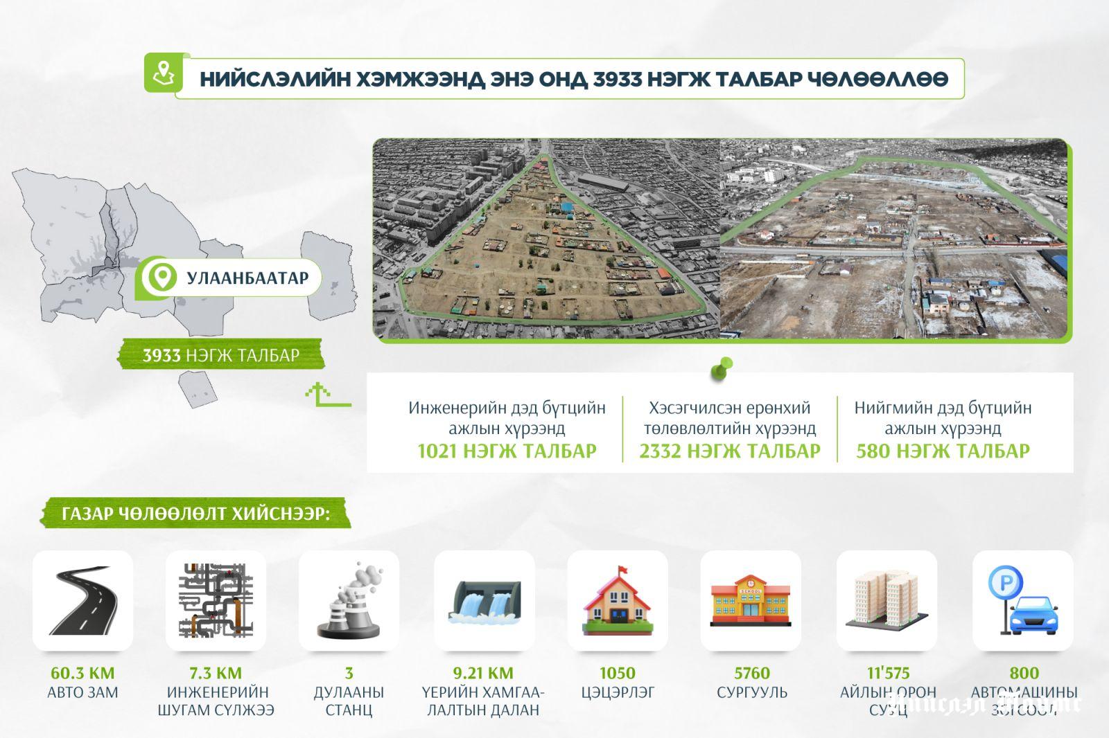 Эдгээрээс инженерийн дэд бүтцийн хүрээнд 1021 нэгж талбар, хэсэгчилсэн ерөнхий төлөвлөлтийн хүрээнд 2332 нэгж талбар, нийгмийн дэд бүтцийн ажлын хүрээнд 580 нэгж талбар чөлөөлжээ. Газар чөлөөлөлт үргэлжилж байна.