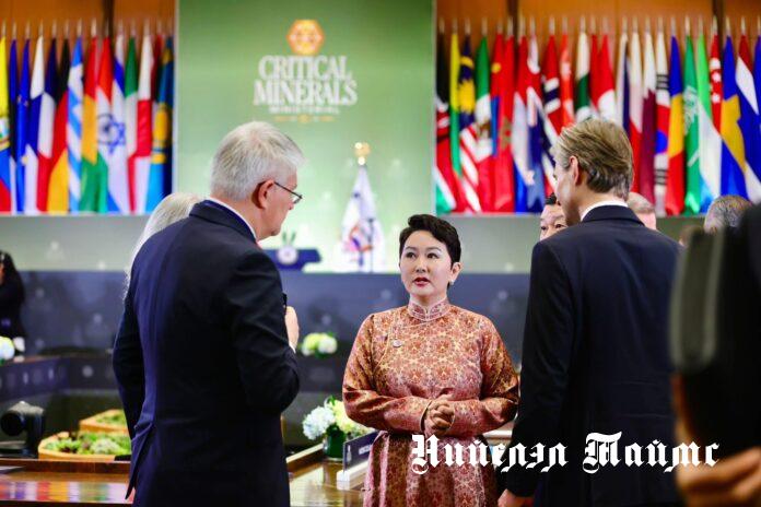 Гадаад харилцааны сайд Б.Батцэцэг АНУ-д ажлын айлчлал хийх үеэрээ тус улсын Төрийн нарийн бичгийн дарга Марко Рубио-гийн санаачилгаар зохион байгуулсан “Чухал ашигт малтмалын асуудлаарх сайд нарын түвшний олон улсын уулзалт”-д оролцов. “Чухал ашигт малтмалын асуудлаарх сайд нарын түвшний олон улсын уулзалт”-д нийт 55 улсын Гадаад хэргийн сайд нар, мөн уул уурхай, ашигт малтмалын асуудал эрхэлсэн бусад төлөөлөгчид оролцов.